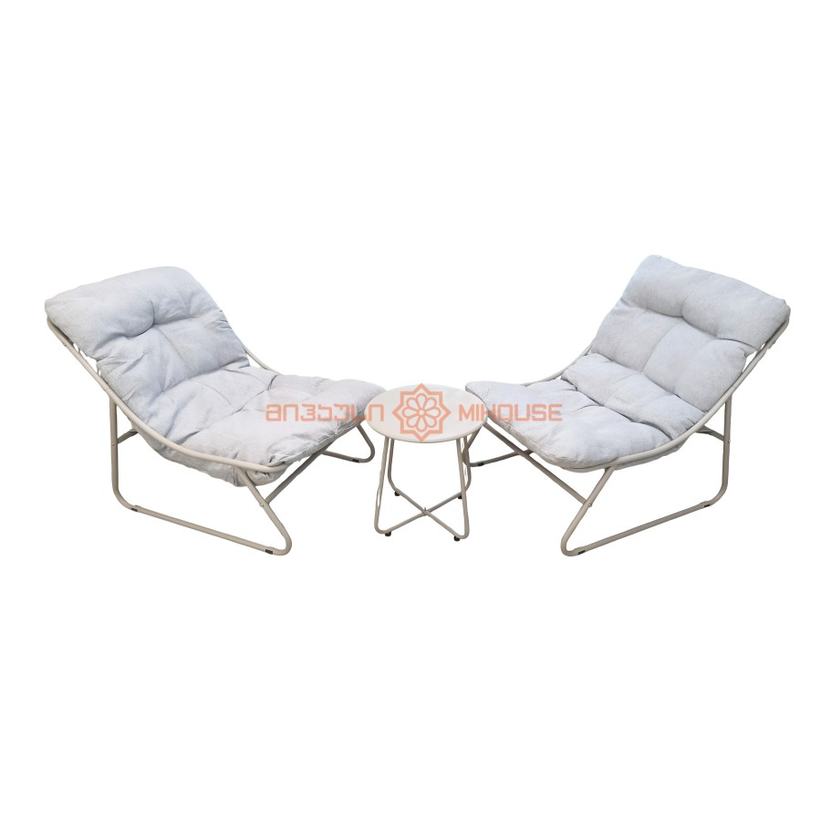 გარე ავეჯის კომპლექტი მოიცავს: 2ცალ ერთადგილიანი სავარძელს ბალიშით - D91*W68*H85 სმ. მეტალის ზომა 22*08/22*1,2მმ 1ცალ ყავის მაგიდას: დიამეტრი 45*H45 სმ. მეტალის ზომა 19*08მმ