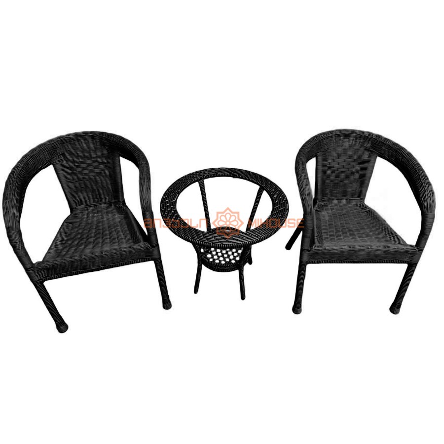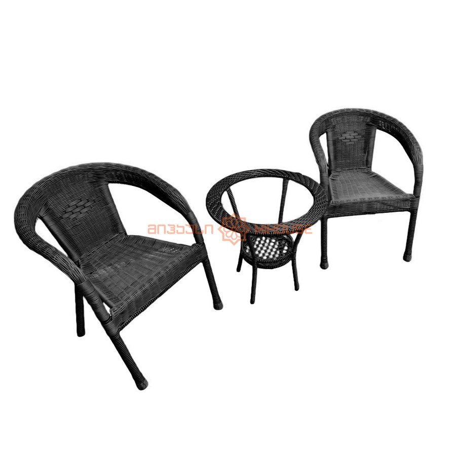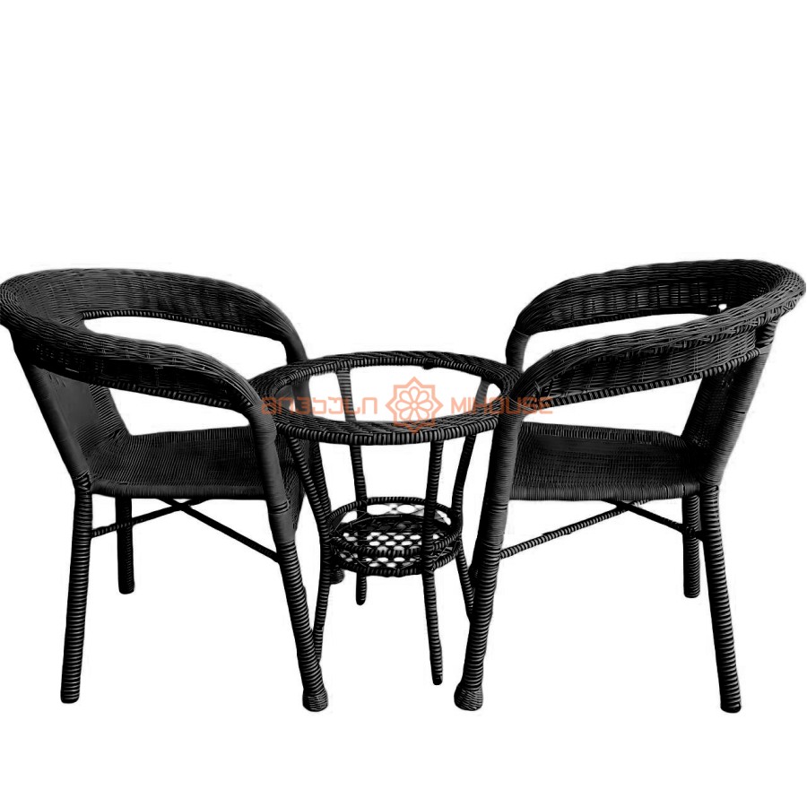 გარე ავეჯის კომპლექტი მოიცავს: 1ცალ შუშის ზედაპირიან მაგიდას: > დიამეტრი 57.5 * სიმაღლე 55.5 სმ > წონა: 2 კგ, მინის ჩათვლით > დატვირთვა - 125 კგ > ქვედა ნაწილში მაგიდას აქვს სათავსო კალათი 2 ცალ სავარძელს > სკამის მასალა: რატანით დაფარული რკინის კარკასი > სავარძლის სიგანე: 44 სმ, სახელურის სიგანე 60 სმ > სავარძლის სიმაღლე 40 სმ, ზურგის სიმაღლე 71 სმ > დატვირთვა: 125 კგ
